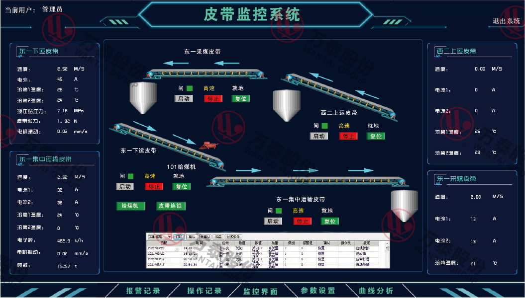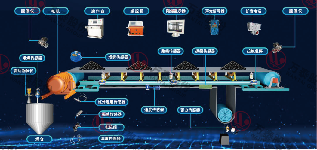 5)系統(tǒng)配有堆煤、跑偏、煙霧、速度、溫度、煤倉煤位、急停閉鎖、縱撕、灑水、斷帶、張力等多項(xiàng)保護(hù);