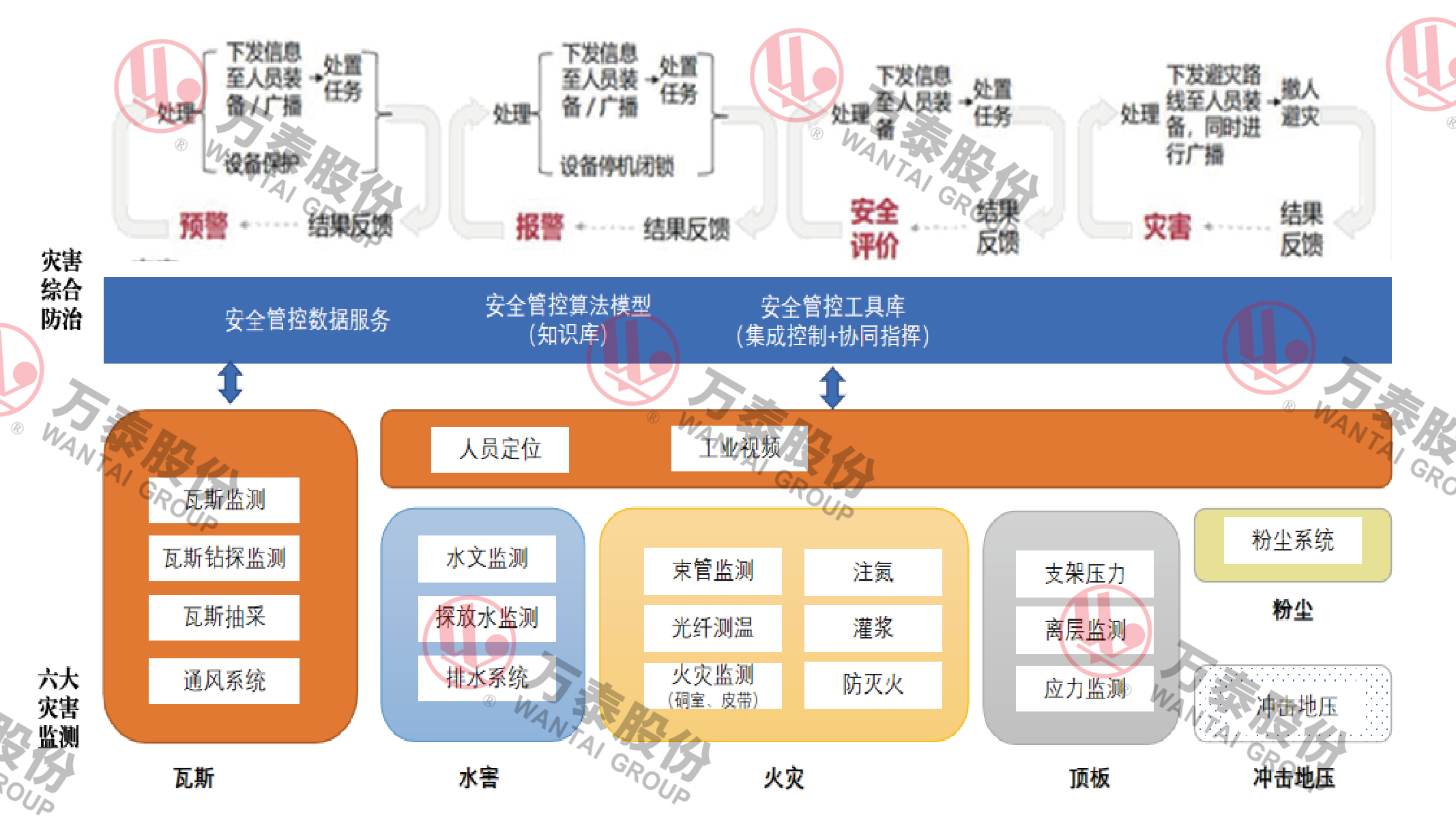 災(zāi)害綜合防治系統(tǒng)是通過(guò)對(duì)井下瓦斯、水害、火災(zāi)、粉塵、頂板、地壓等災(zāi)害監(jiān)測(cè)系統(tǒng)集成,綜合運(yùn)用人工智能、大數(shù)據(jù)、物聯(lián)網(wǎng)、云計(jì)算、移動(dòng)互聯(lián)、機(jī)器學(xué)習(xí)、三維仿真建模等技術(shù)手段,緊緊圍繞著煤礦安全管理,融合礦井“人、機(jī)、環(huán)、管”多系統(tǒng)、跨業(yè)務(wù)監(jiān)測(cè)監(jiān)控?cái)?shù)據(jù),基于多源異構(gòu)數(shù)據(jù)統(tǒng)一集成規(guī)范、多系統(tǒng)融合聯(lián)動(dòng)技術(shù)、災(zāi)害成因機(jī)理和大數(shù)據(jù)分析技術(shù),構(gòu)建智能災(zāi)害綜合防治系統(tǒng),實(shí)現(xiàn)煤礦瓦斯、水、火、頂板、粉塵等災(zāi)害信息的監(jiān)測(cè)預(yù)警和災(zāi)害模擬仿真,為災(zāi)害超前治理和源頭管控提供依據(jù),提升礦井災(zāi)害防治水平,實(shí)現(xiàn)礦井災(zāi)害智能化防控。